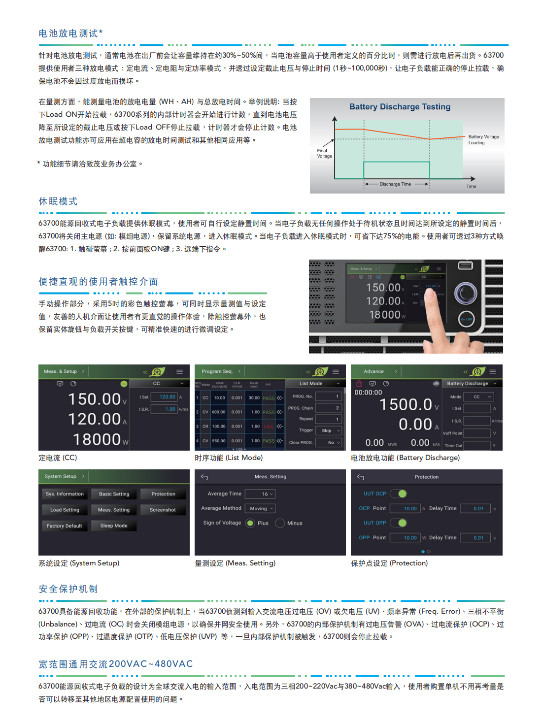 63700系列能源回收式直流电子负载,适用于电动车电池放电、燃料电池放电、大功率电源老化、直流充电桩、单向车载充电器可靠性、燃料电池发动机系统、储能系统、AC/DC与DC/DC电源供应器、功率电子元件及电力电子元件等产品信赖性测试使用。
