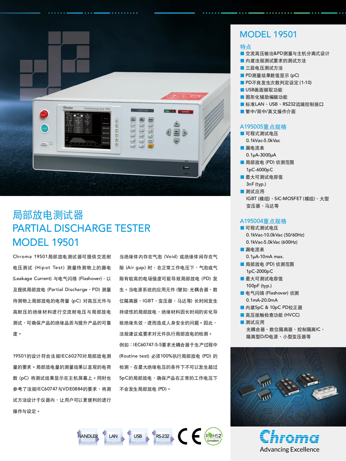 Chroma 19501局部放电测试器可提供交流耐电压测试(Hipot Test)测量待测物上的漏电(Leakage Current)与电气闪络(Flashover),以及提供局部放电(Partial Discharge,PD)测量待测物上局部放电的电荷量(pC)对高压元件与高耐压的绝缘材料进行交流耐电压与局部放电测试,可确保产品的绝缘品质与提升产品的可靠度。