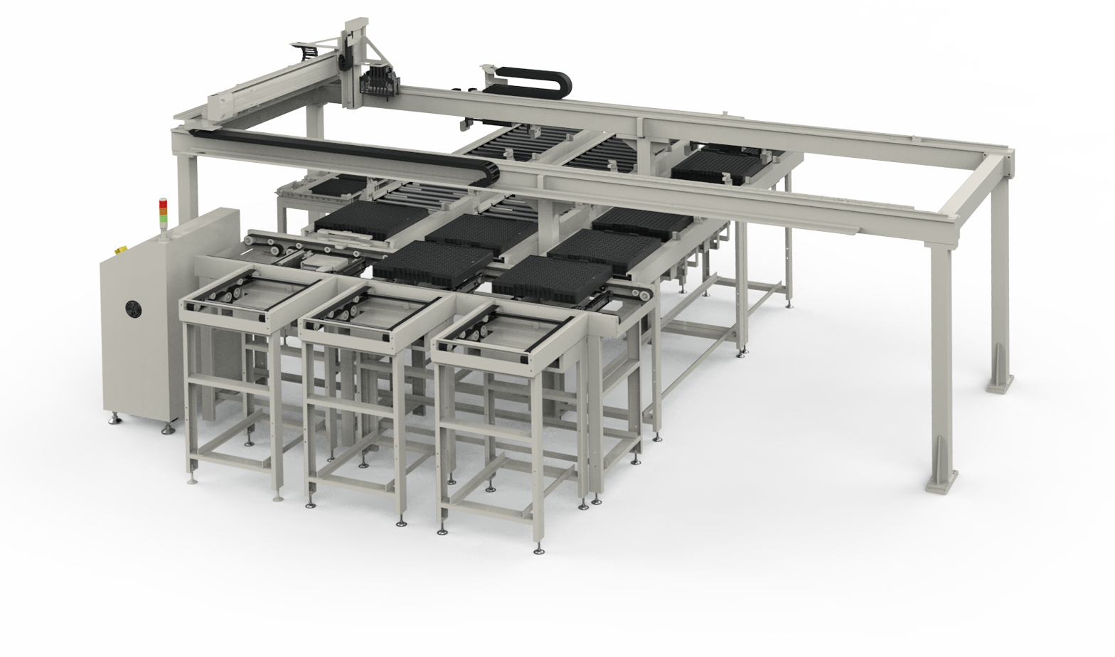电池化成整体解决方案依据产能与生产模式分为全自动与半自动生产线,以载盘式生产,电池芯放置于载盘物流到各制程站点进行测试,主要的制程站点有化成充放电系统、条形码链接设备、OCV/ACR/DCIR量测设备、重工挑选机、分级设备、静置仓储系统。半自动生产线为人员在各站点间执行入料与出料操作,各站点自动进行测试与数据搜集,生产工艺一致稳定可靠,制程站点间基本上由人员运行,而辅以流程管制系统可避免人员错误。