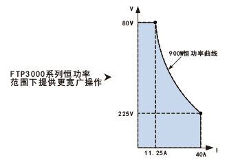 FTP3000系列拥有超过3.5倍宽范围输出量程,支持恒功率输出功能。输出开启后, 电源不断调整输出电压或输出电流,使输出功率维持恒定。若负载超出电源的调节范围,输出将维持在最大设定值。(注意:恒功率输出功能主要应用于响应速度10ms以上的负载。)