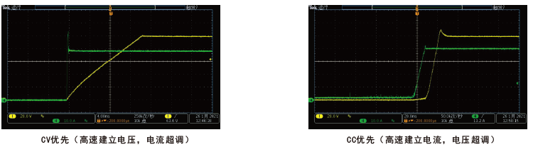当电源输出接入感性或容性负载时会造成输出电流或电压一定程度的过冲,轻则触发被测设备保护,严重的将直接导致被测设备损坏。FTP3000系列具备CV、CC输出优先功能从而有效抑制输出过冲及带来的影响。