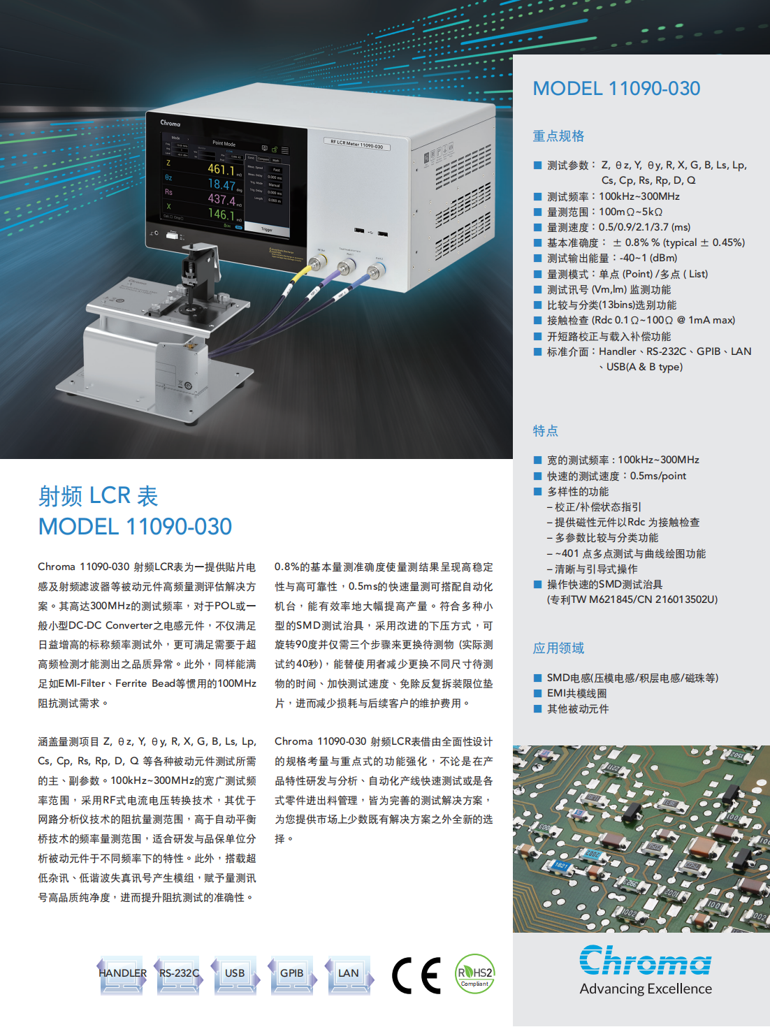 Chroma 11090-030射频LCR表为一提供贴片电感及射频滤波器等被动元件高频量测评估解决方案。