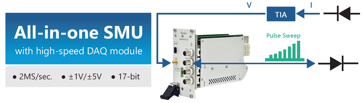 52403P短脉冲SMU内建2M Sample/sec. DAQ (资料撷取)模块, 能够搜集和计算来自高速Photodiode和搭配的TIA (Transimpedance Amplifier) 产生的电压信号,实现LIV量测。因为单一SMU即可执行LIV量测,大大降低了测试系统的整合难度,也节省了大量的开发时间。