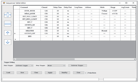 为了提供便利的使用环境,Chroma提供了多种软体控制面板,以应对高速脉冲产生器输出编辑,只需在高速脉冲产生器模组软体控制面板输入几个脉冲参数,即可完成输出编辑,如图7示意。应对高精密量测,Chroma则提供一个SMU模组软体控制面板,在输入主要设定参数后,如:range、clamp、aperture time、loop bandwidth和输出值,即可以进行高精度测试和量测,如图8示意。应对需要精确时序控制量测,Chroma提供硬体序列引擎,因为在执行期间不受PC OS延迟影响,能依设定时间执行命令,一旦SMU接收触发讯号,硬体将逐行执行时序表中的指令,如9示意。